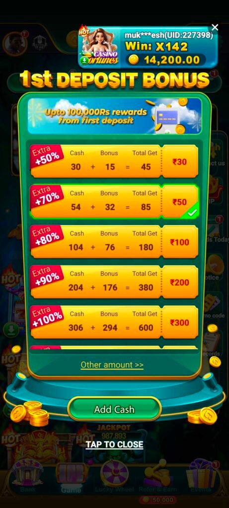 New users receive an instant Rs.210 signup bonus upon registration. This allows players to explore games without investing their own money initially.